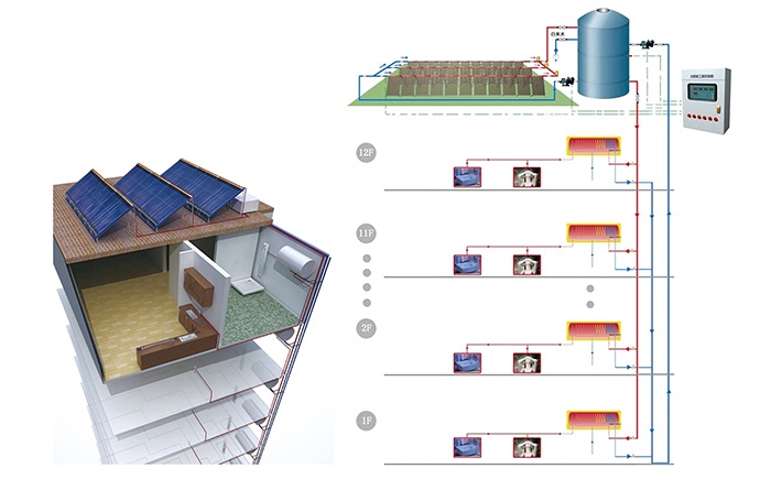集熱系統集中放置在屋面等適合安裝的位置,分戶儲熱水箱可在室內靈活放置;